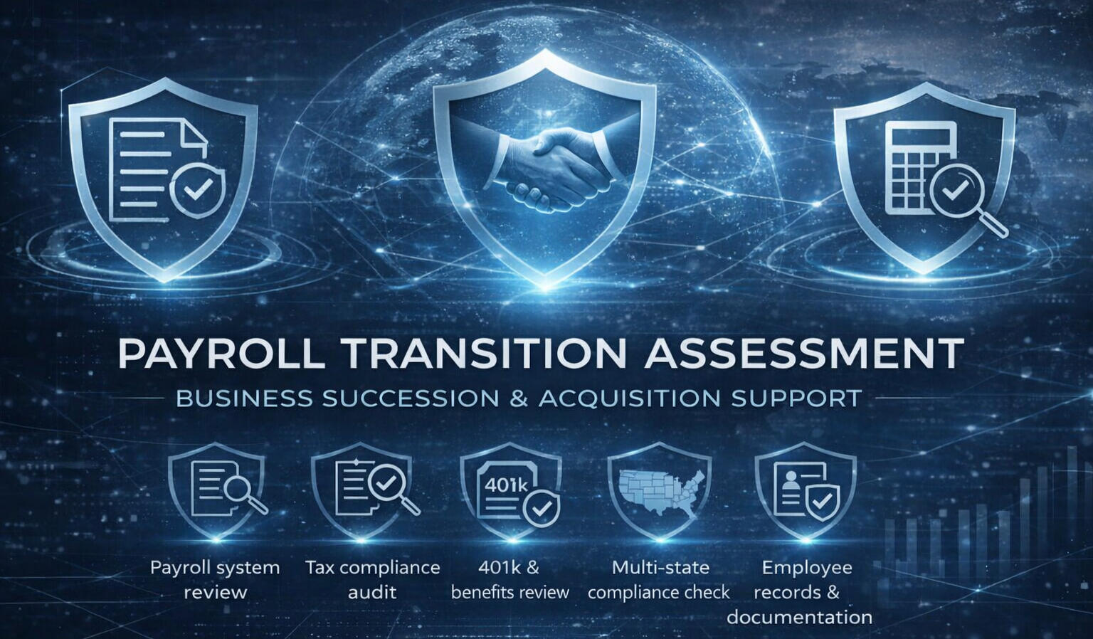 Our Payroll Transition Assessment is a comprehensive review designed specifically for businesses navigating succession, acquisition, or ownership change. We identify tax liabilities, 401k misconfigurations, multi-state compliance gaps, and documentation issues before they become the new owner's problem.